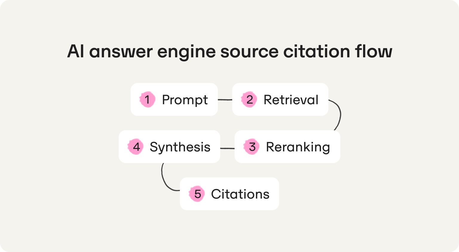 • 2. Reranking: The retrieved sources do not all carry equal weight. A reranking layer scores them against the specific prompt, taking into account signals like content structure, topical authority, recency, and how cleanly the page answers the question being asked. This step is model-specific and not publicly documented. It is also where the same domain can perform very differently across two similar prompts.