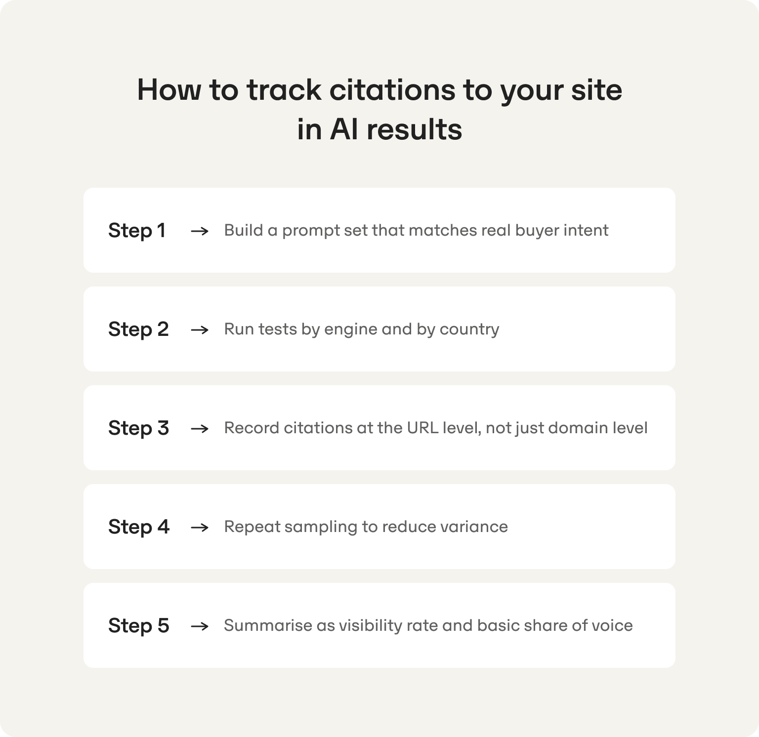 A citation is a source URL that an AI engine surfaces as the basis for its answer. A mention is your brand name appearing in the answer body without a source URL attached. Both matter, but they point to different problems. Cited but not mentioned suggests an entity clarity issue. Mentioned but not cited suggests a content extractability issue. Neither suggests both gaps need closing. Tracking both in parallel, with two additional columns in your existing spreadsheet, gives you the full picture.