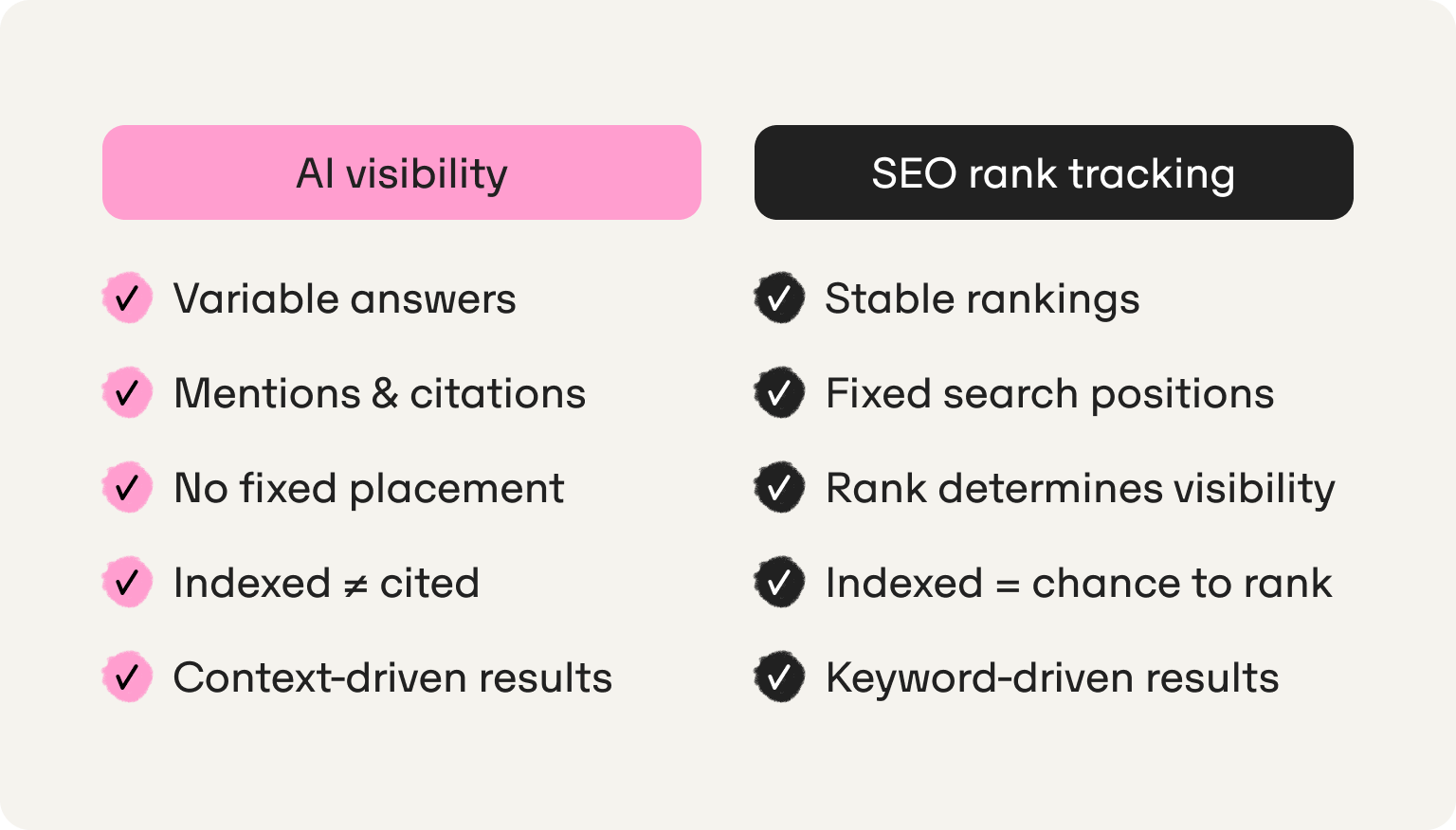 Traditional SEO is deterministic. Google crawls your page, assigns a rank, and that position typically remains stable. AI search is variable — ask ChatGPT the same question twice and you might get different answers. The “rank” doesn't exist, only mentions and citations that shift based on context.