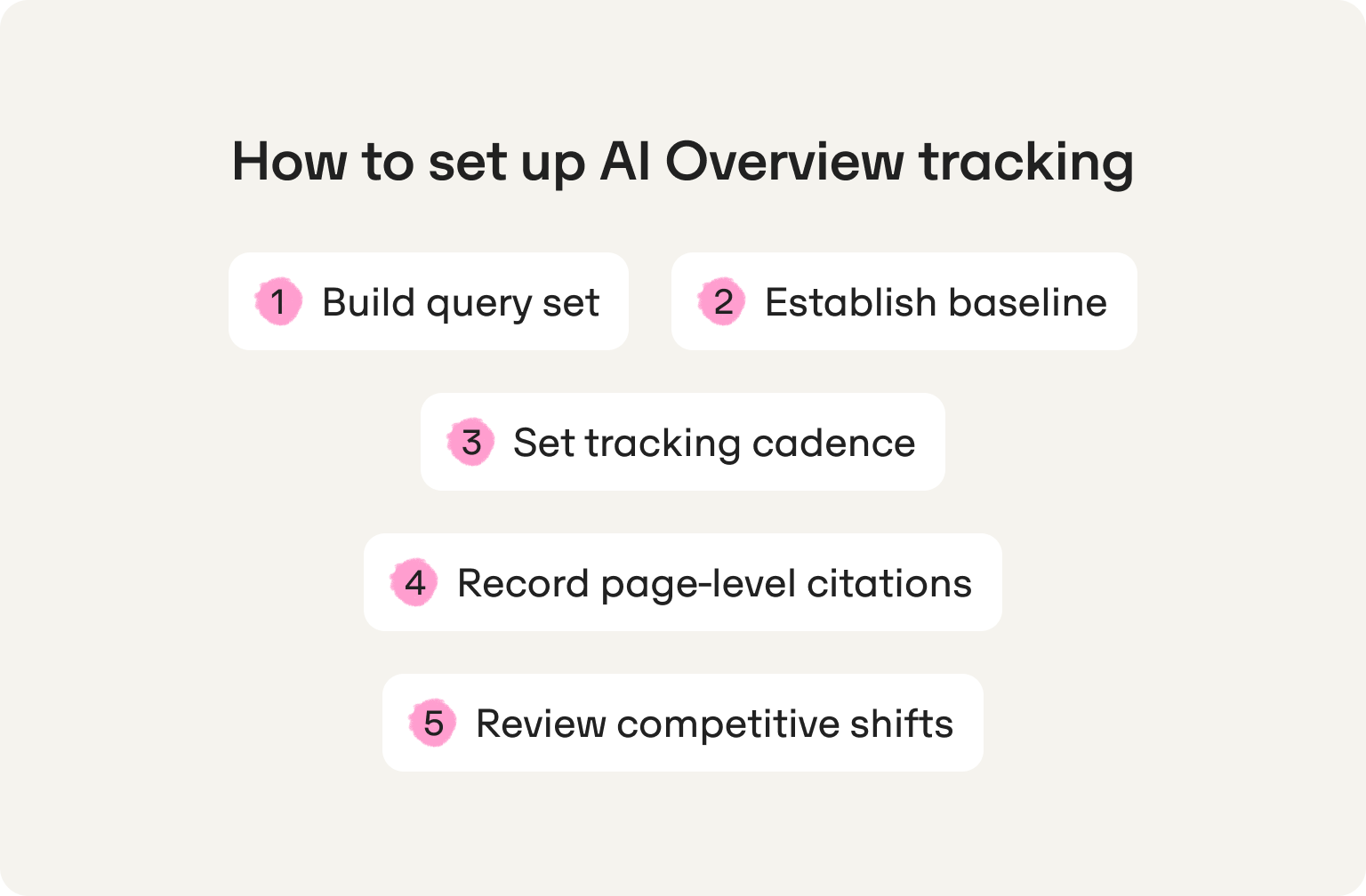 Effective AI Overview tracking requires monitoring a defined query set at a fixed weekly cadence, recording citation sources historically, and detecting competitive shifts before they consolidate. Google Search Console doesn't isolate AI Overview clicks, and standard rank trackers measure organic position, not citation presence. This guide covers how to build a query set, establish a baseline, track competitive citation shifts, connect visibility data to traffic impact, and distinguish a Google-side change from a content-side failure.