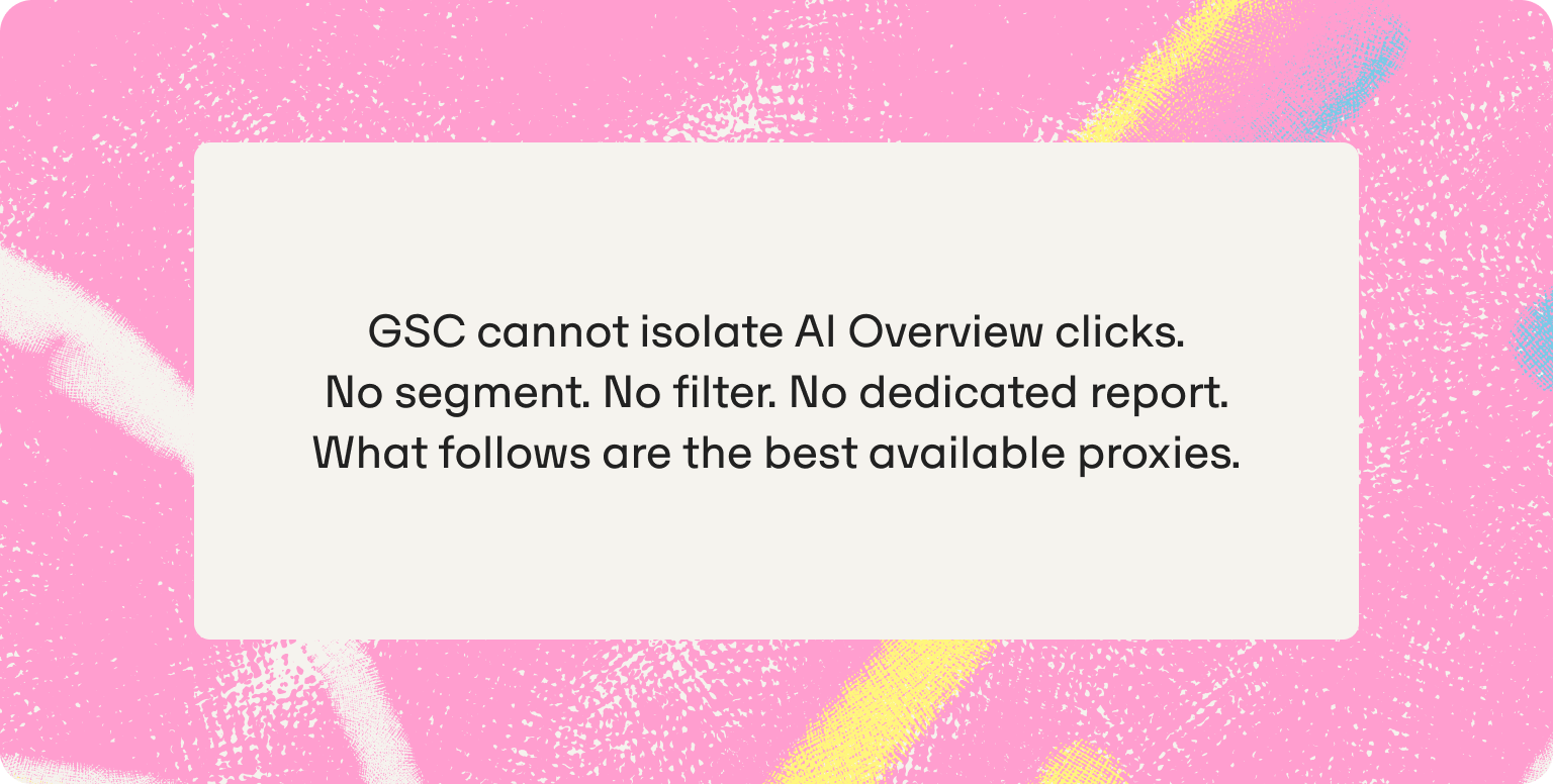 Google Search Console does not isolate AI Overview clicks. There is no filter, no segment, and no dedicated report that separates traffic arriving from an AI Overview citation from traffic arriving from a standard organic result. This is not a workaround problem. There is no clean solution in GSC today. What follows are three proxy methods that produce meaningful signals.