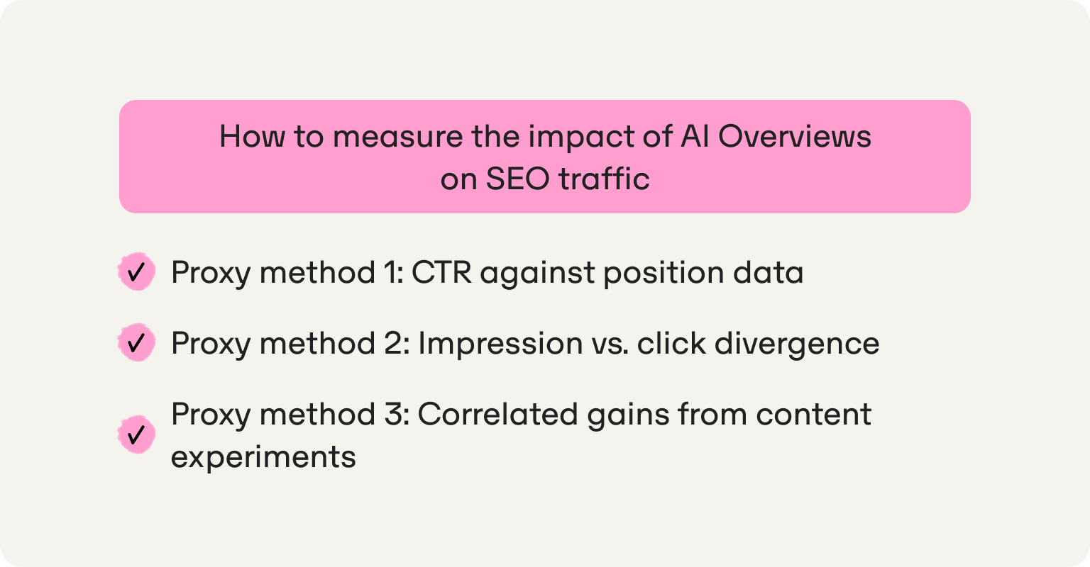 This is where most SEO leads hit a wall. The tracking system built in the previous section tells the reader what happened in AI Overviews. What it can't do — and what no tool currently does cleanly — is produce a direct attribution line between AI Overview citation and organic traffic. That limitation needs to be stated plainly before the proxy methods are introduced, because building a leadership narrative on a measurement that doesn't exist will eventually backfire.