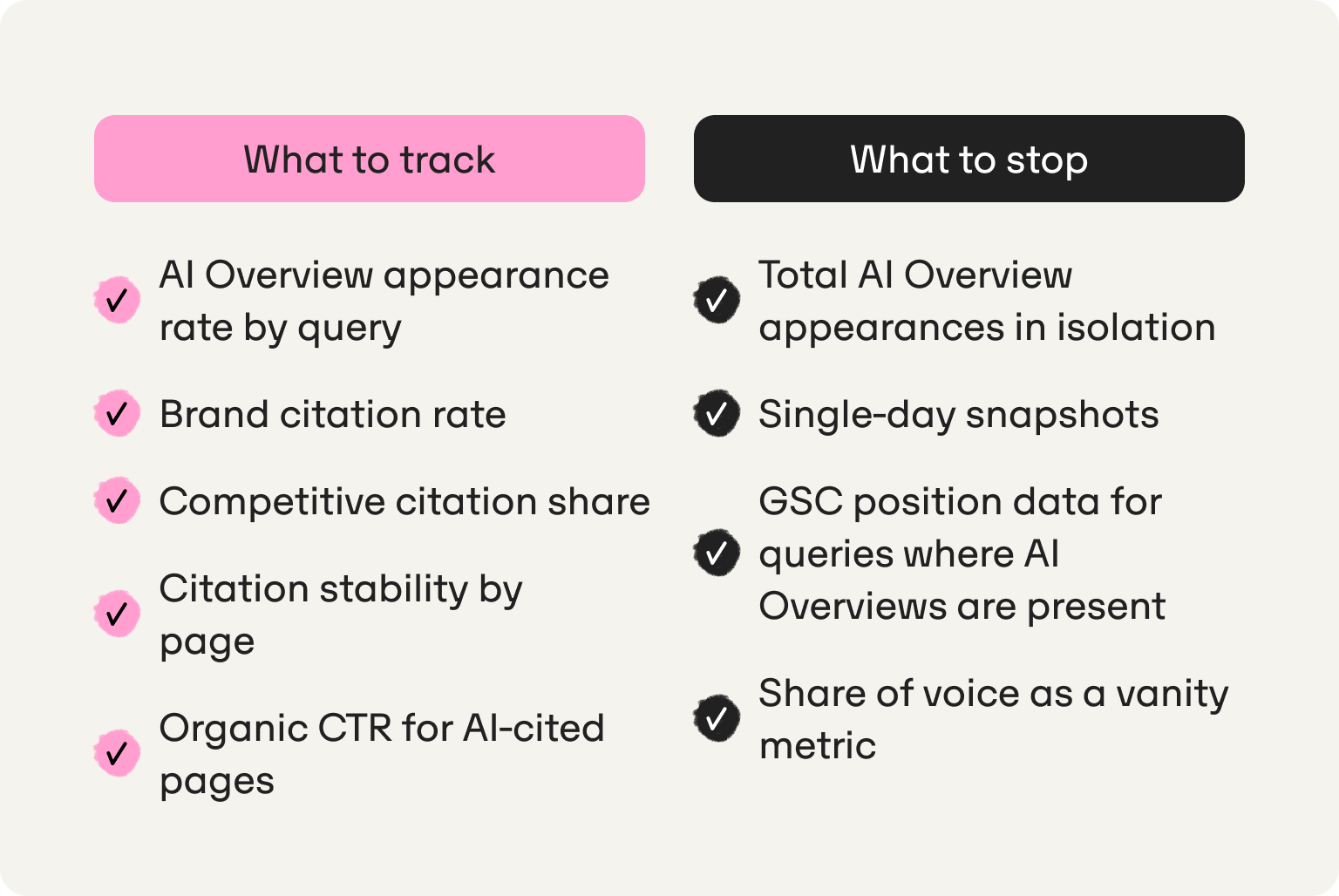 The question SEO leads get asked isn't "did AI Overviews hurt us?" It's "can you show me what changed and what we did about it?" The measurement system doesn't need to produce clean attribution to answer that question. It needs to produce a before and after on citation presence, a trend line showing direction of travel, and a correlation between content actions and GSC signals. That's a reportable narrative. A team running manual spot-checks has a guess. A team running a structured citation tracking system has a case.