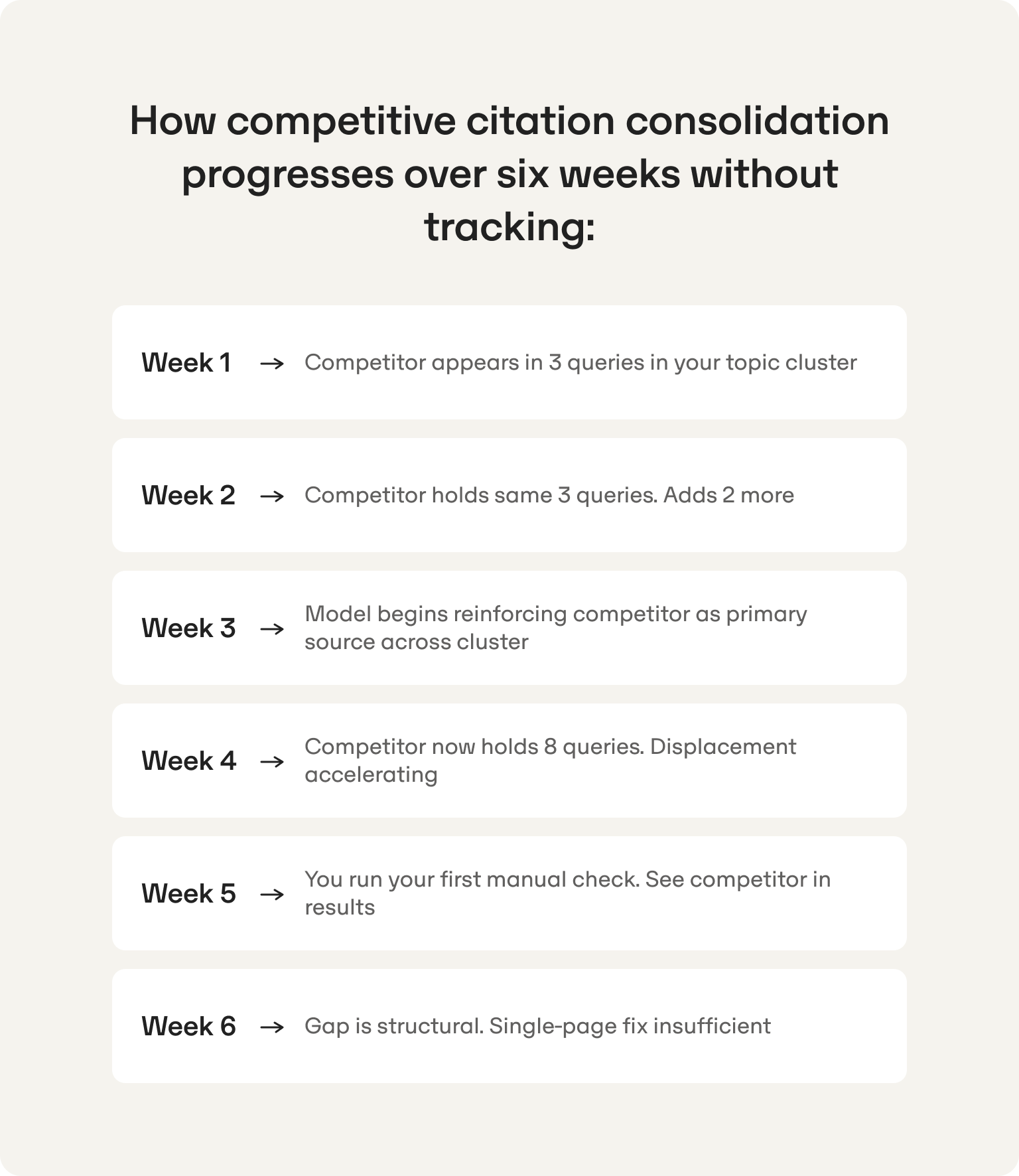 These two patterns require different responses. Topical consolidation by a single competitor is a structural problem that requires a content cluster response — not a single-page fix. Fragmented competition is an opportunity to move first on the queries that matter most before any one competitor establishes the same consolidation. Tracking competitive AI visibility at this level of granularity is what separates a tracking system that produces decisions from one that produces reports.