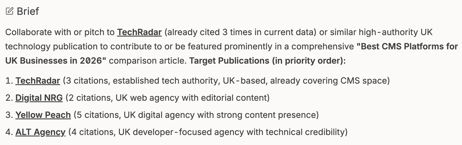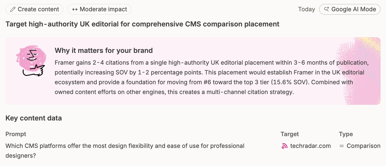 This is where Omnia's action layer excels. When tracking a prompt where your brand ranks #6 with 10.9% share of voice, Omnia analyzes which third-party sources currently earn citations, calculates that a single high-authority editorial placement could deliver 2-4 new citations within 3-6 months, and provides a ready-to-execute outreach brief. You get specific target publications, positioning angles, content requirements, and rationale based on current citation patterns.