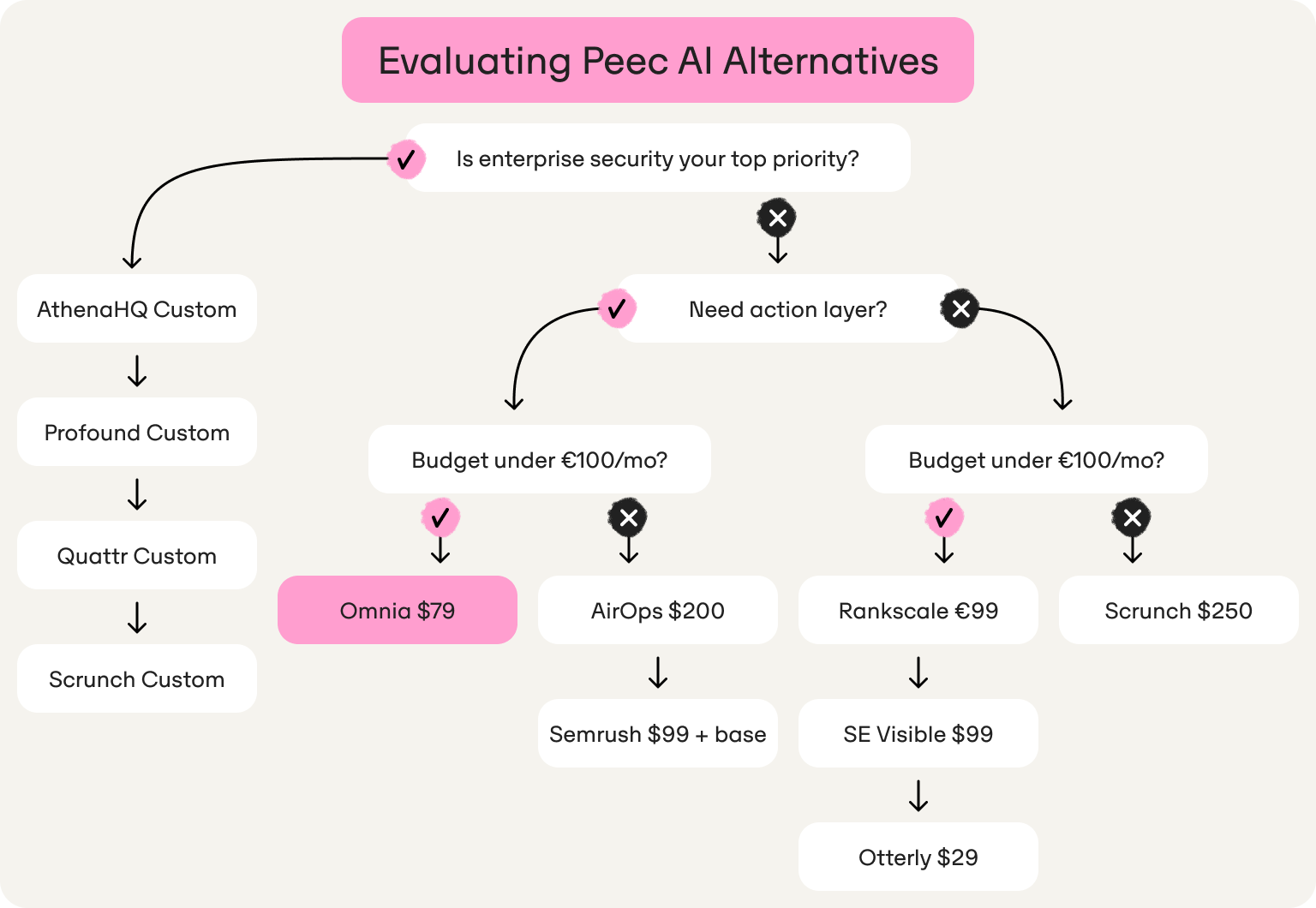We ranked 10 Peec AI competitor tools based on what scaleup growth teams truly need: region-based tracking without surcharges, citation intelligence showing which domains win, and an action layer that outputs what to publish next. Omnia ranks #1 because it starts at €79 with unlimited geographical coverage and converts monitoring data into executable content briefs, outreach strategies, and technical recommendations.