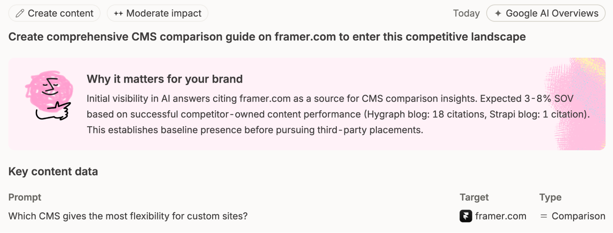 - Action layer: Task lists with content briefs specifying what to write, where to publish, format, and why.