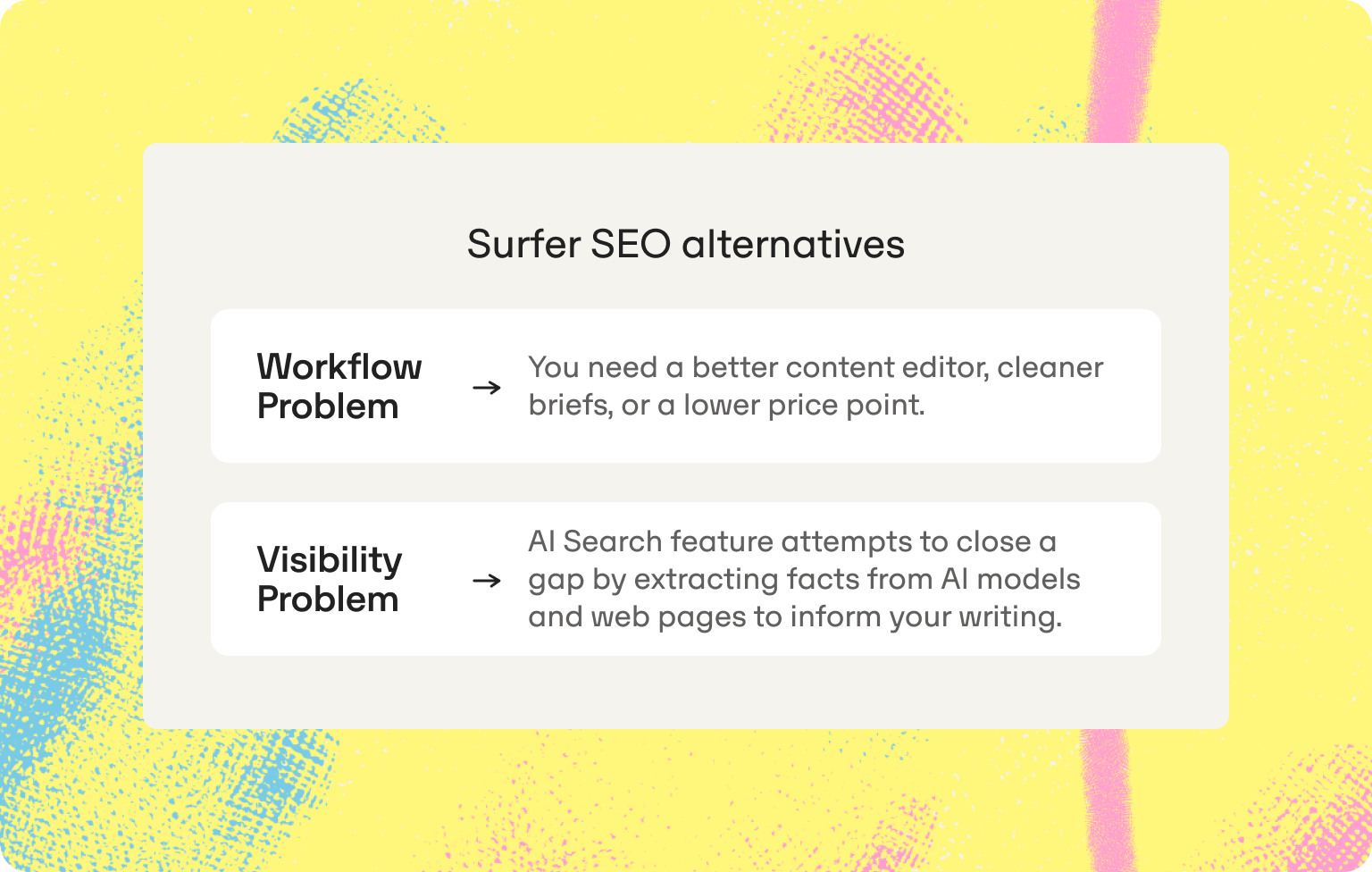 But if part of the reason you're reconsidering is that organic traffic keeps flattening despite publishing optimized content, that's worth naming directly. AI search engines now intercept buyer questions before users reach your articles. A content editor swap won't fix an AI displacement problem. That’s why we’ve compiled 12 of the best alternatives to Surfer SEO, no matter which problem you’re facing.