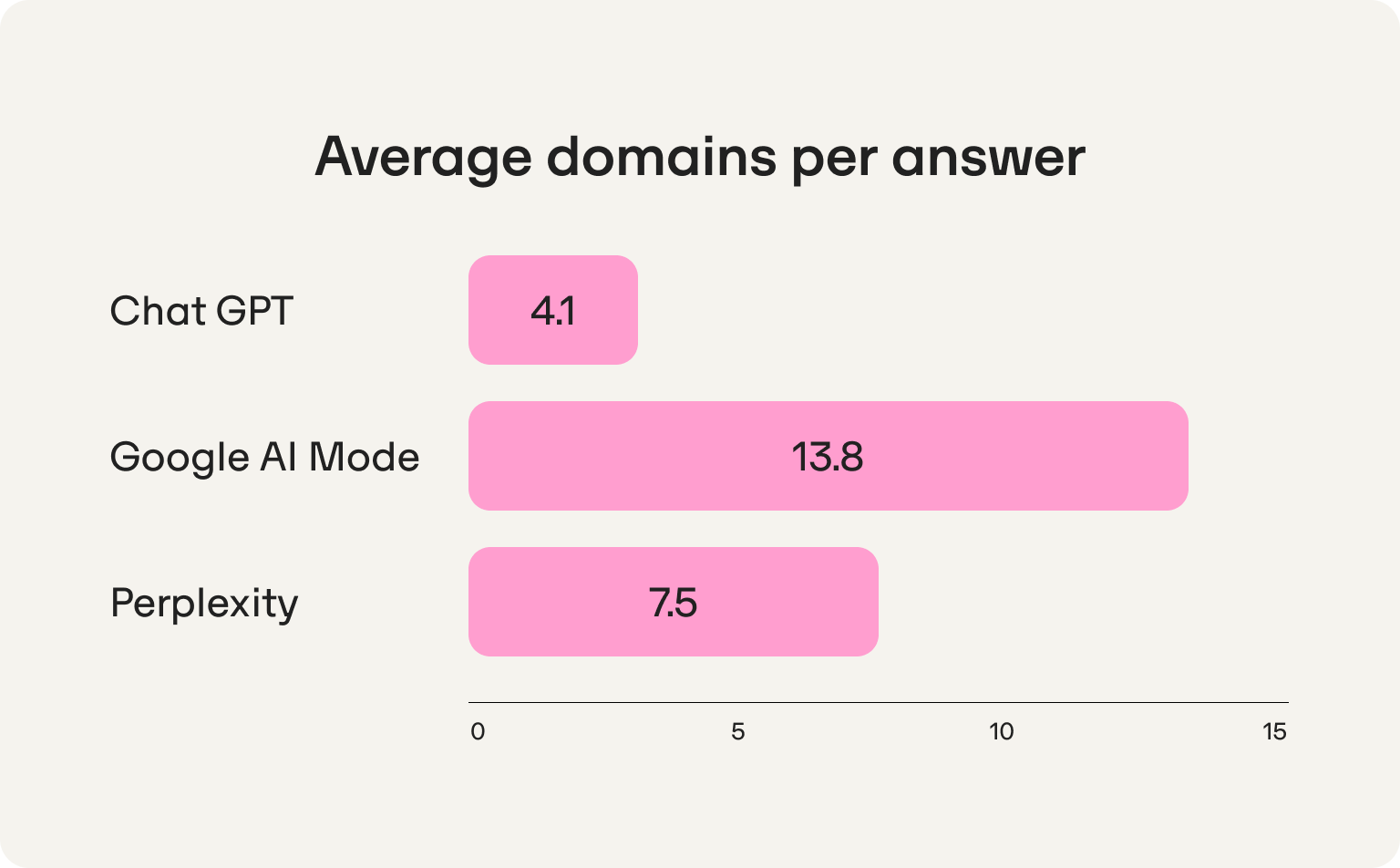 This is a harder problem than traditional ranking. Based on Omnia's proprietary citation database tracking 42M+ citations, ChatGPT averages just 4.1 domains per answer. That’s roughly 3x more selective than Google AI Mode, which averages 13.8. A typical AI Overview pulls from 9.2 sources. Perplexity sits at 7.5. There are a fixed number of slots per query, and traditional content scoring can't tell you whether they're winnable for your domain.
