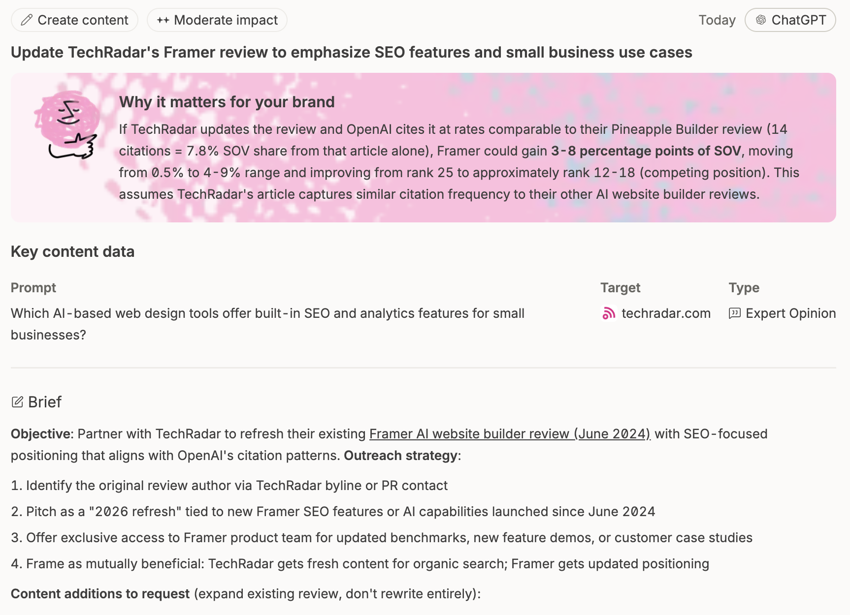 Where execution-oriented platforms go further is pre-publish outcome projection. Before any content is written, Omnia builds a business case based on real competitor citation benchmarks, projecting expected share of voice for a given prompt set. It also delivers a brief and outreach strategy.