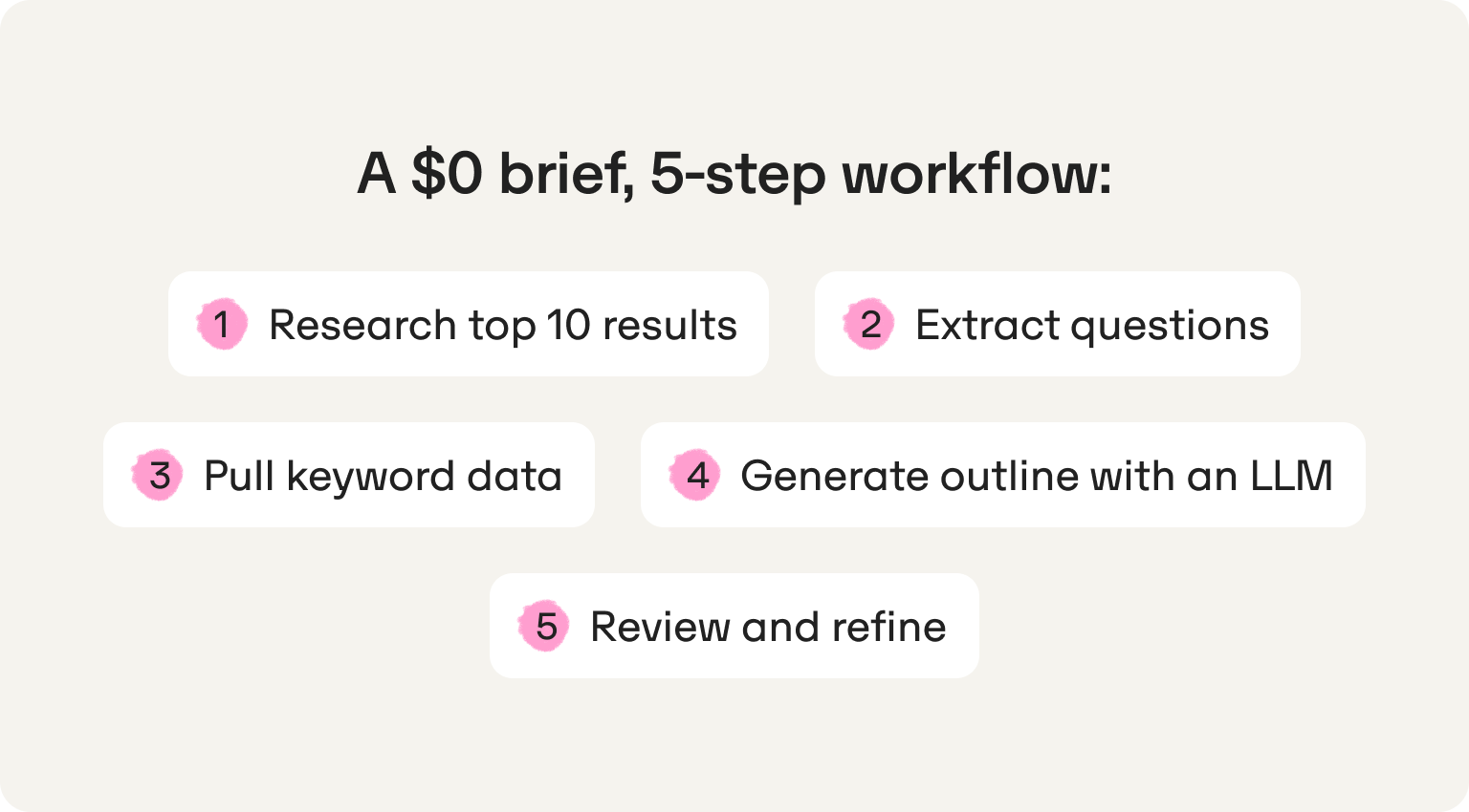 A realistic free stack combines Google Search Console for keyword and traffic data, People Also Ask extraction for question discovery, manual competitor analysis for topic identification, and ChatGPT free tier for outline generation with structured prompts. It's functionally usable but requires 2+ hours per article vs 30 minutes with paid automated tools. This method is best for validating your content process before committing subscription budget or for very low-volume publishing.