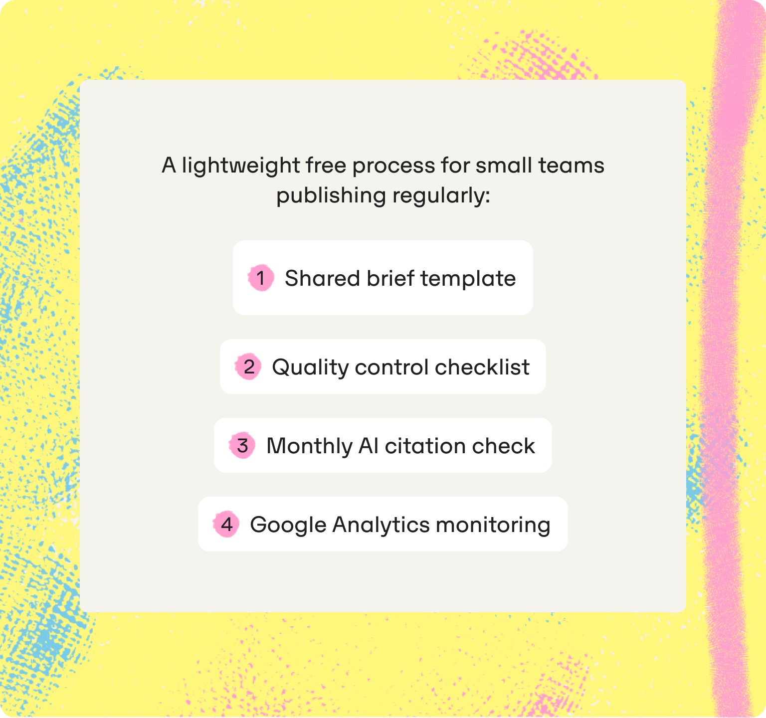 - Quality control checklist (above): Before publishing, assign a teammate to review every draft against the manual scoring checklist. Catches gaps the writer missed. Maintains quality standards without automated scoring.