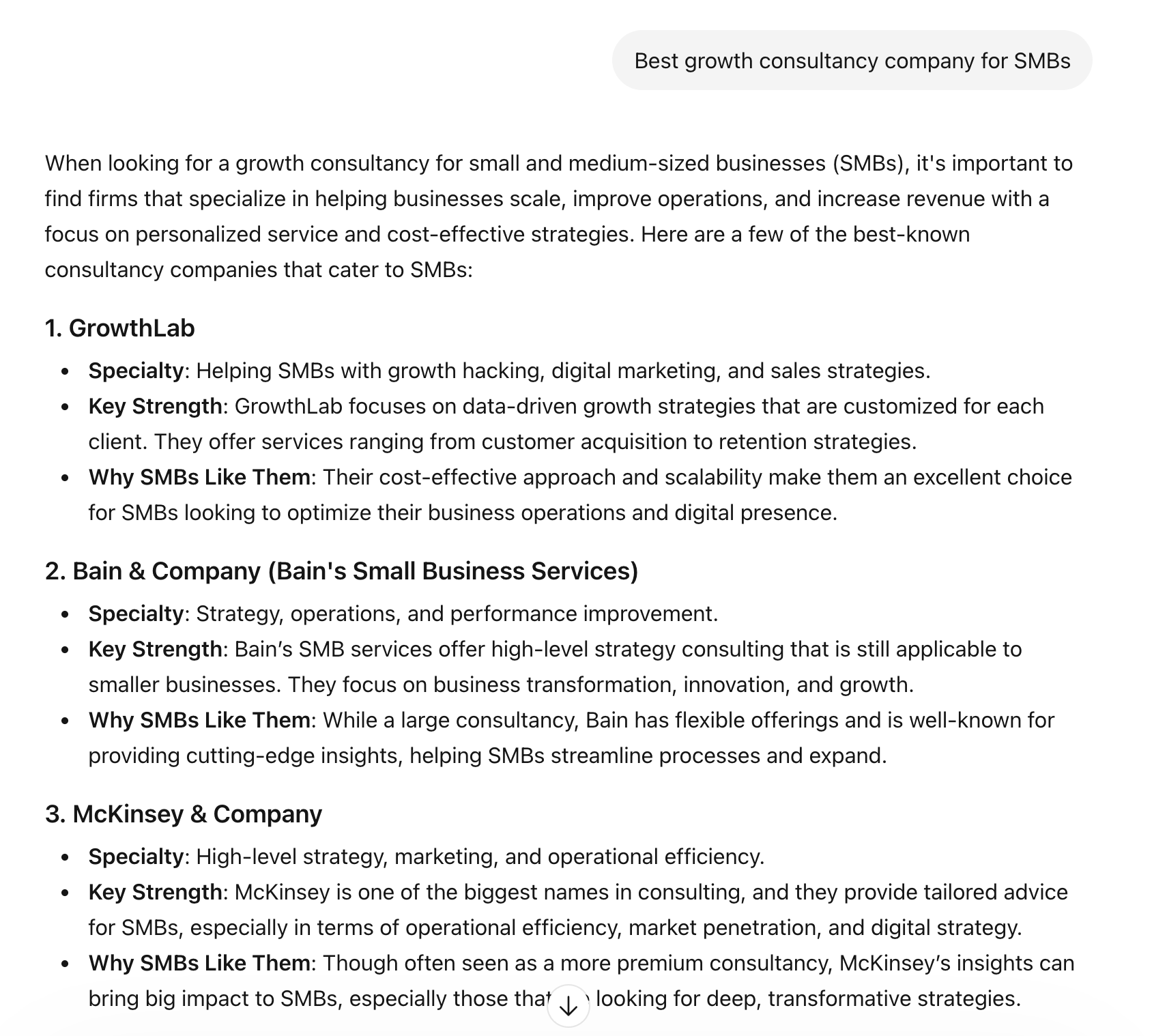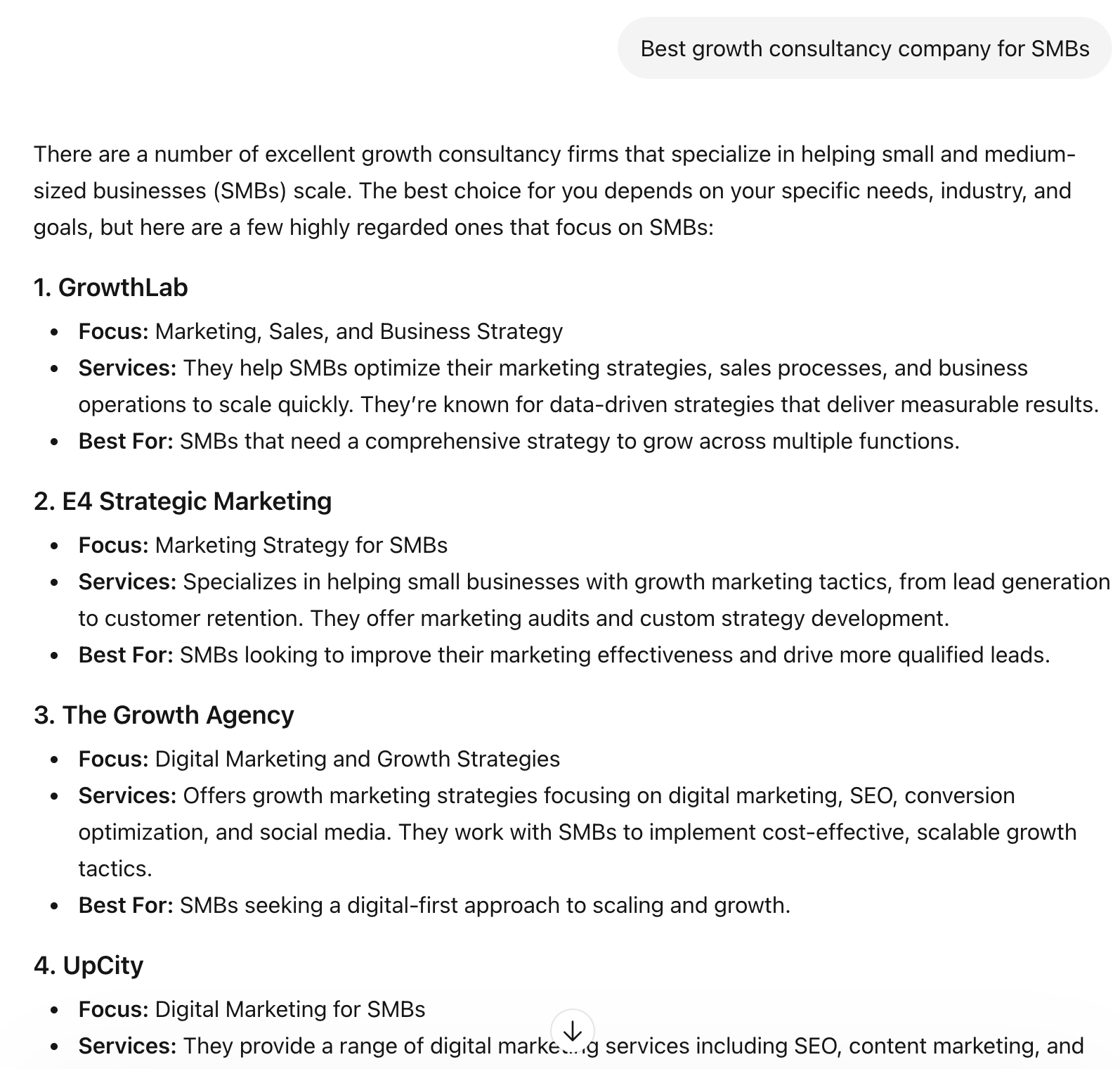 AI answer outputs vary by engine and locale. The same prompt asked in Google AI Mode from a US IP versus a UK IP can return different brand recommendations because AI platforms weight regional sources. Ask ChatGPT “Best growth consultancy company for SMBs” from New York versus London, and the top recommended brands often differ.
