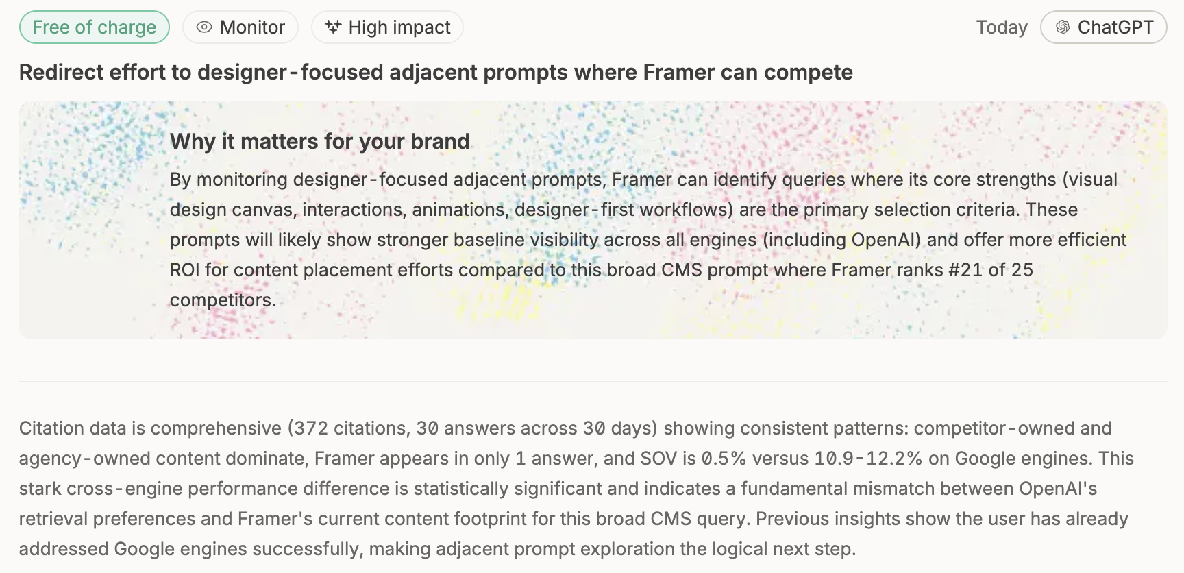 - Identifies citation gaps by comparing which prompts cite competitors but not you