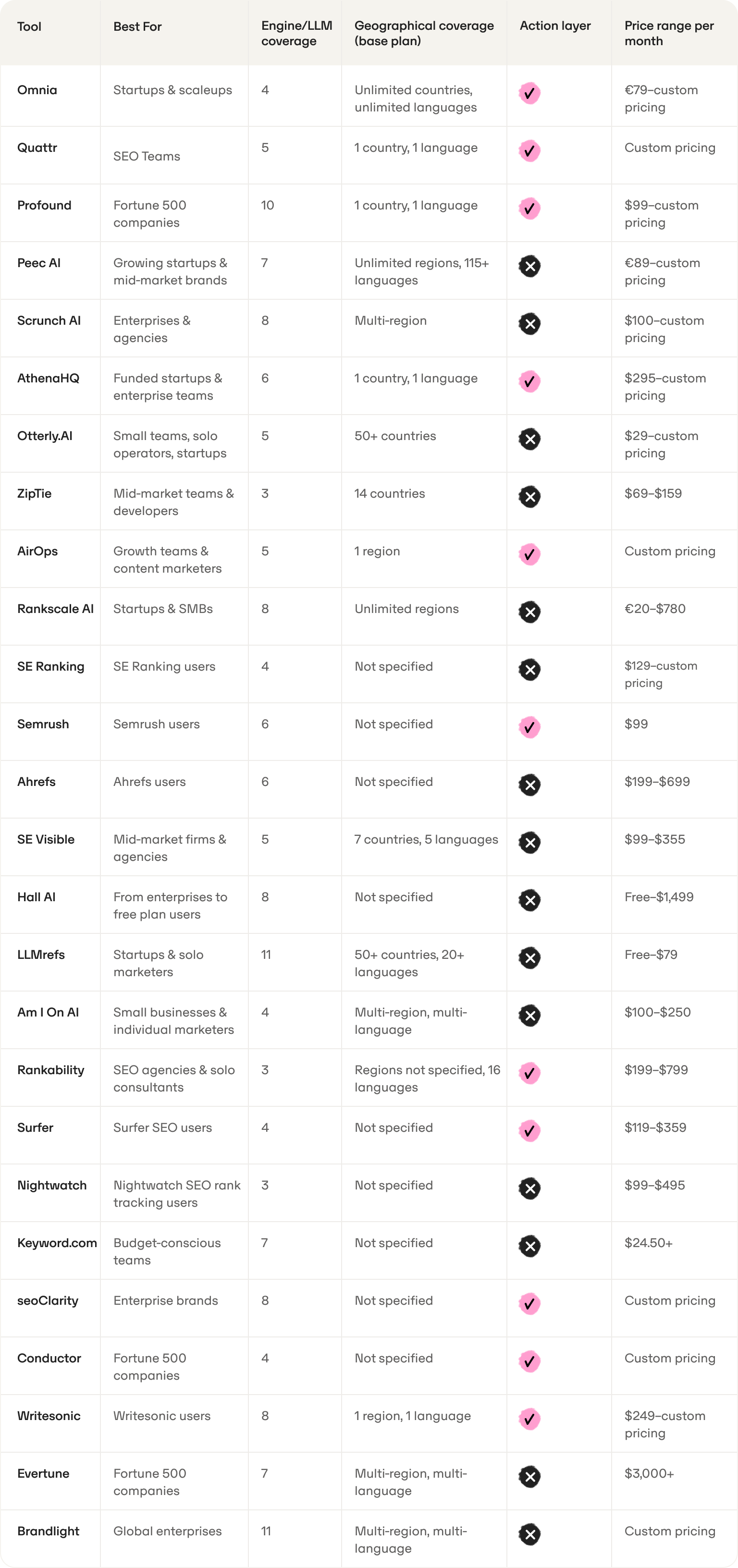 Pricing is well-above the market average, with the lowest plan only providing access for one user, one language, and one AI search engine.